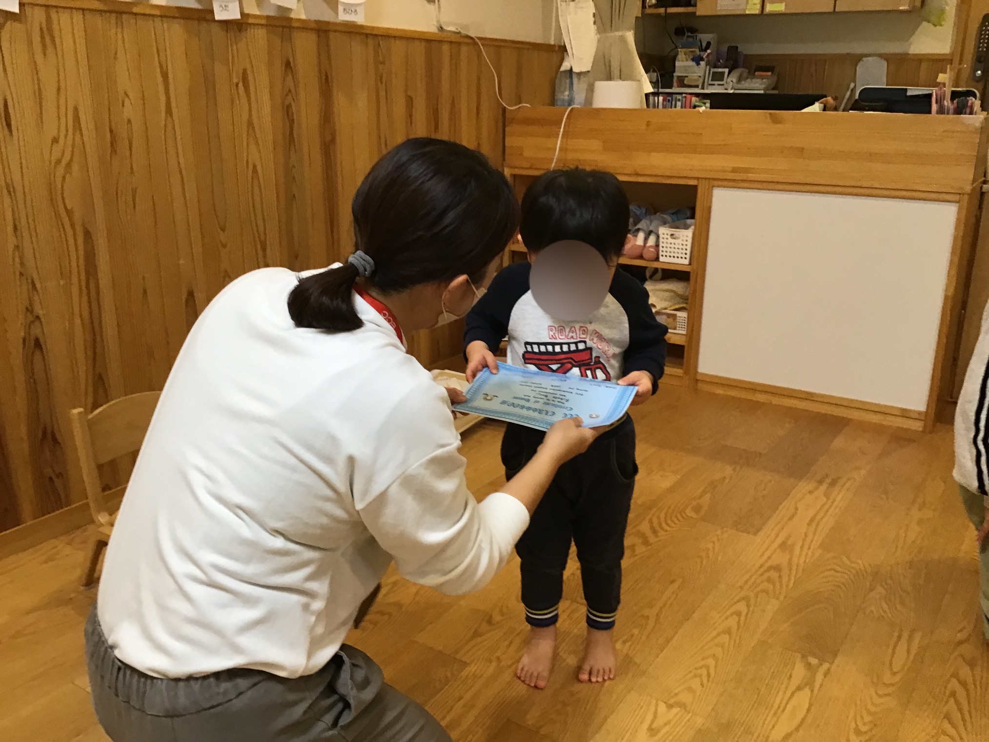 そして、一年間がんばりましたということで一人ずつ証書を受け取りました。恥ずかしがりながらも「サンキュー」と言って受け取りました。