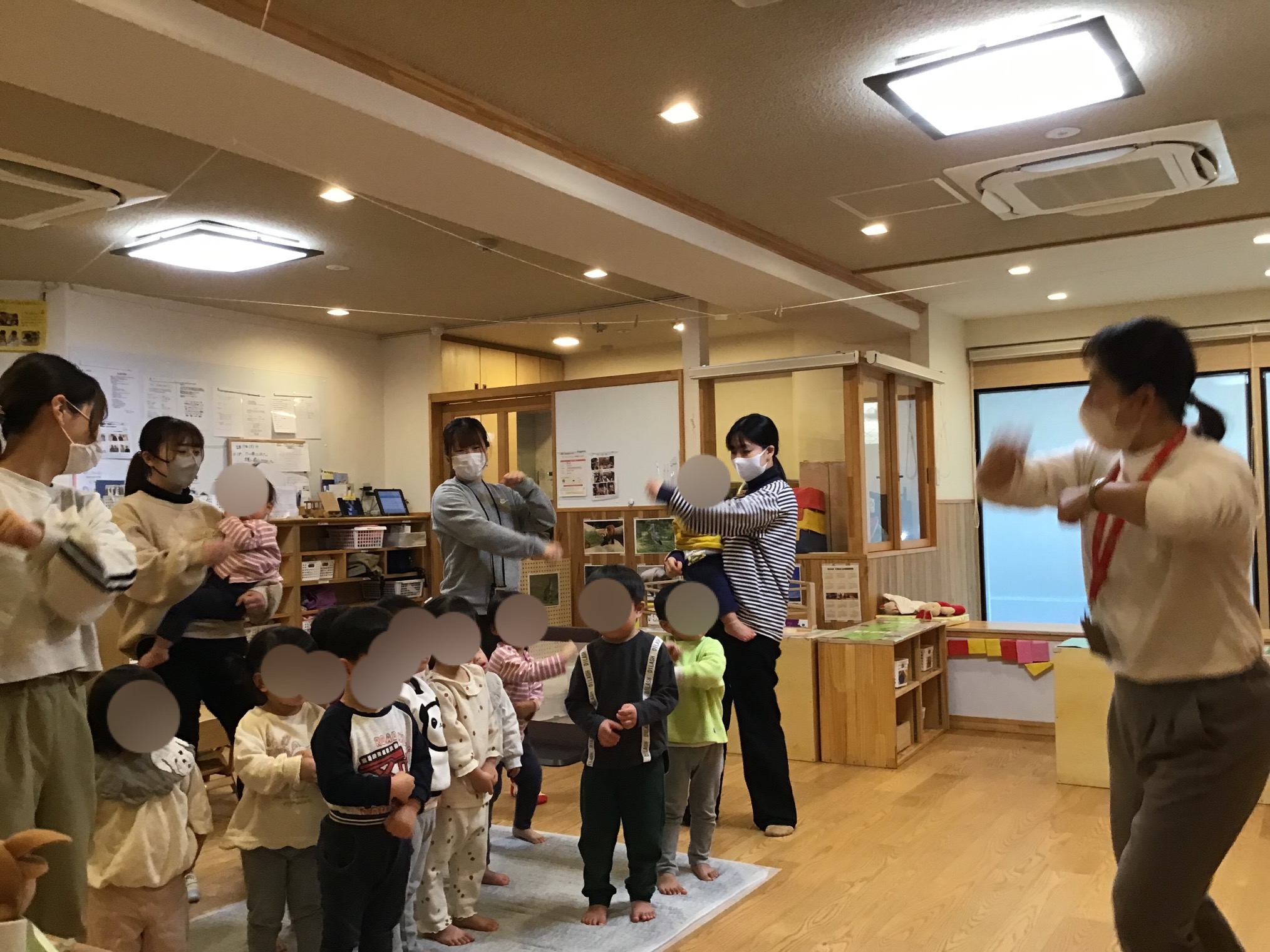 まる、さんかく、しかくの形を英語で発言したり、英語のダンスを歌いながらみんなで踊って楽しんでいました。