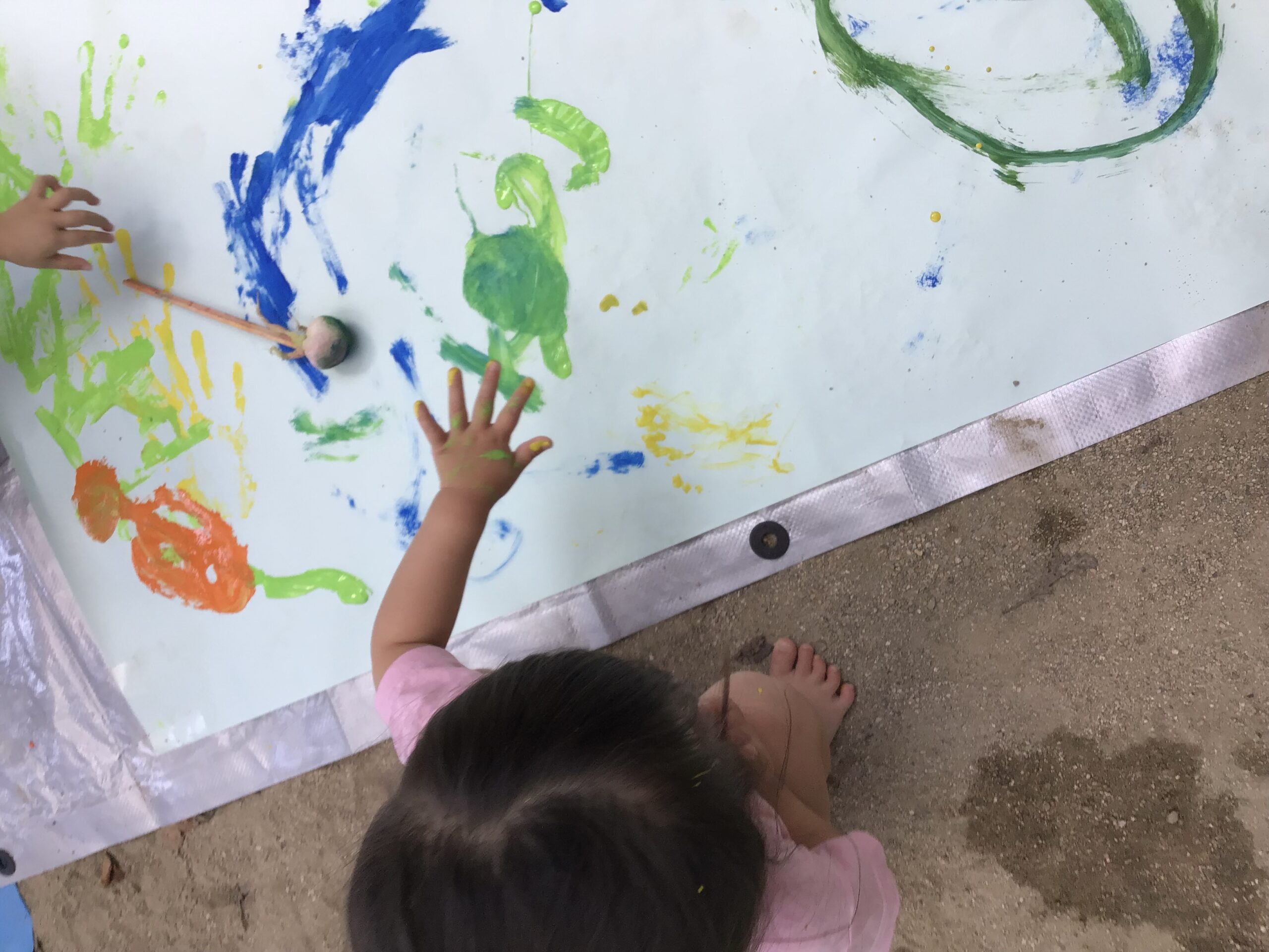手や足を使い絵の具で模造紙に色をつけたり、泡遊びではコップやお皿に泡を乗せることを楽しんでいました。又、泥遊びでは、スコップを使って穴を掘ったり、泥水の中に入って泥の感触を楽しんだりと手足を真っ黒にしながらダイナミックに遊ぶ姿がありました。