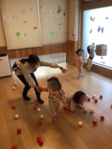 ボール遊びでは、終了の合図が聴こえてくるまで夢中になってボールを箱や袋の中に入れていました。