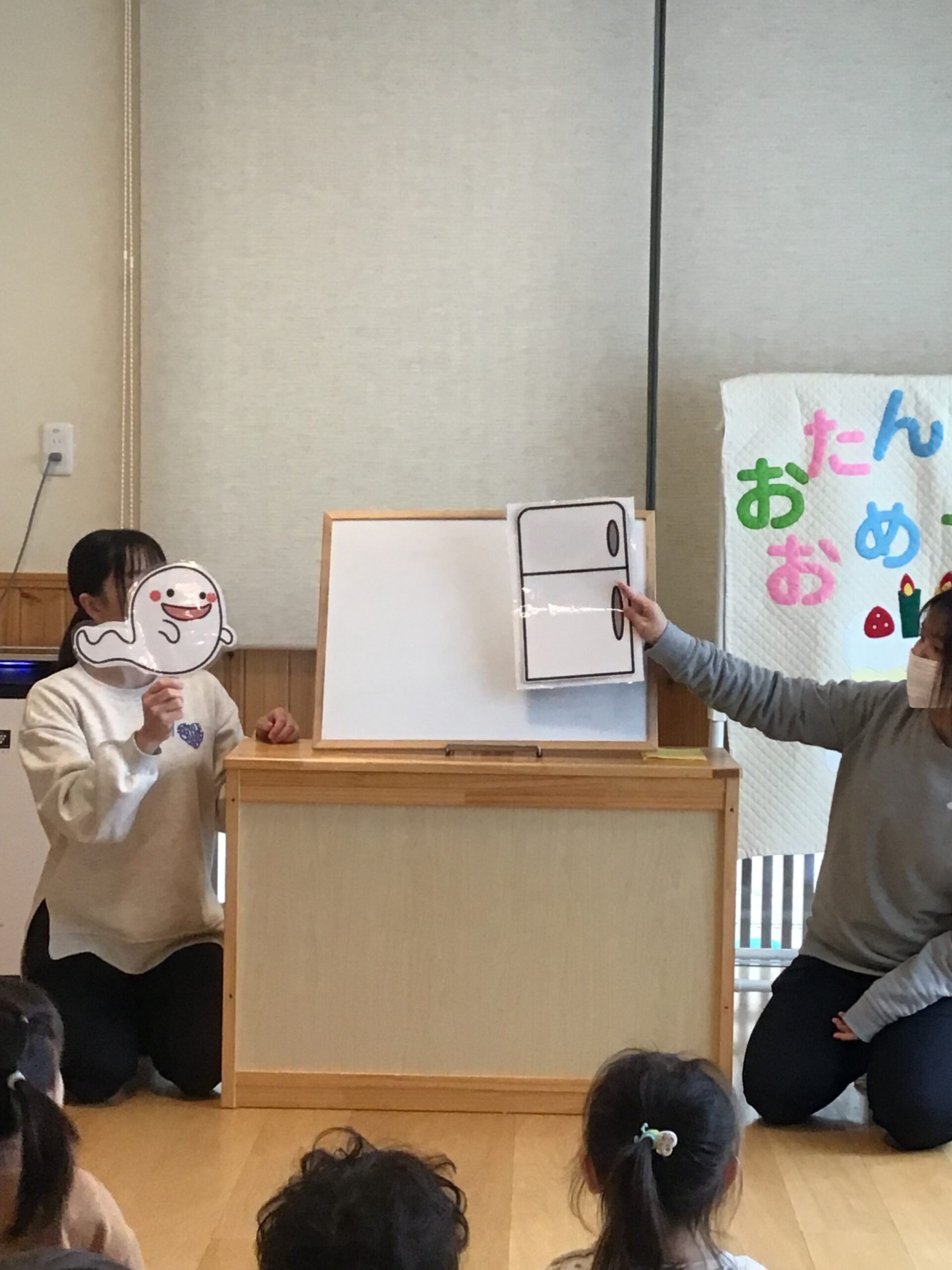 保育者からのプレゼントは”くいしんぼうおばけ”のペープサートでした。