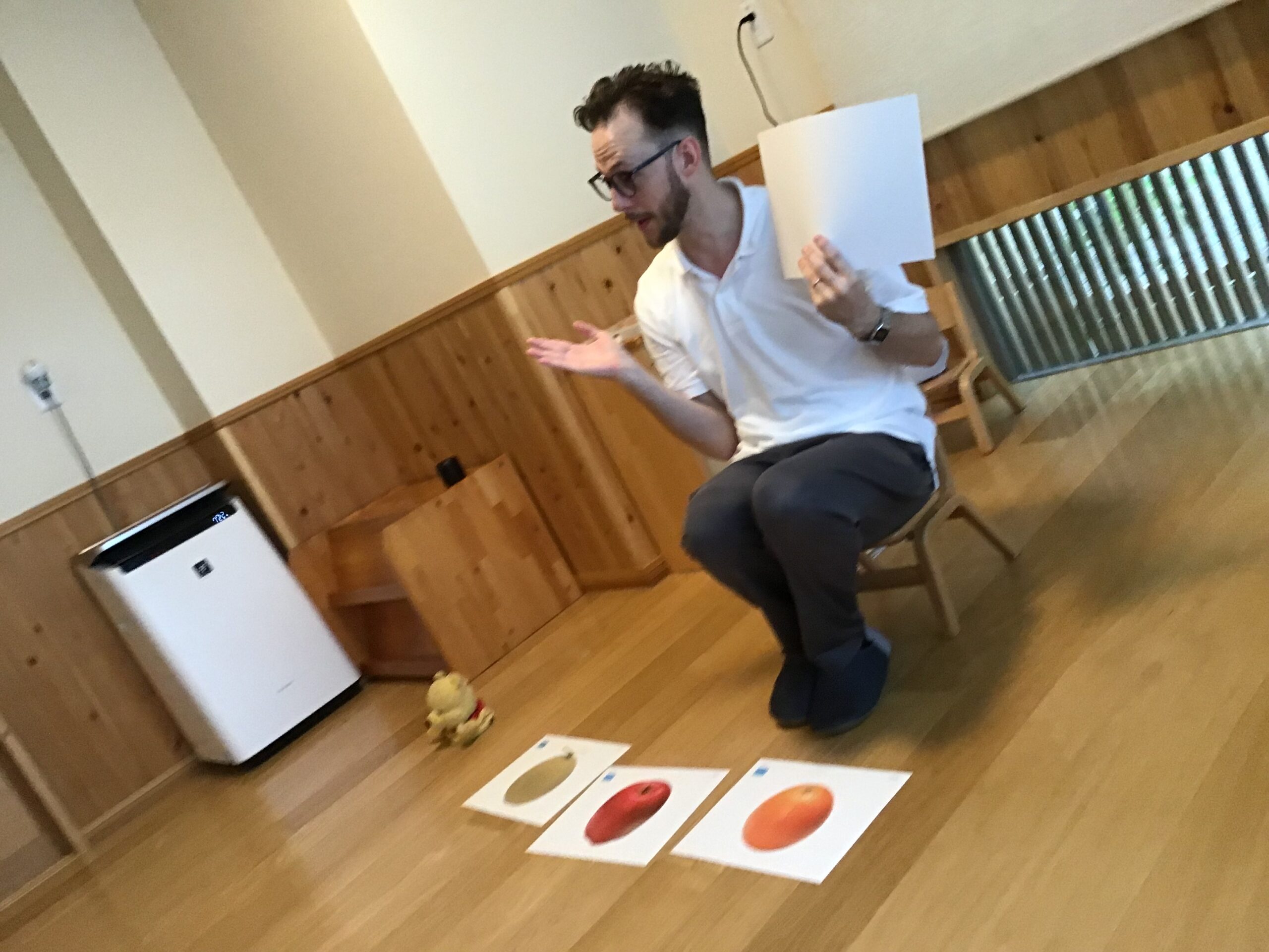 ネイティブの先生から色や果物の単語を教えてもらいました。黄色の果物を探したり、
